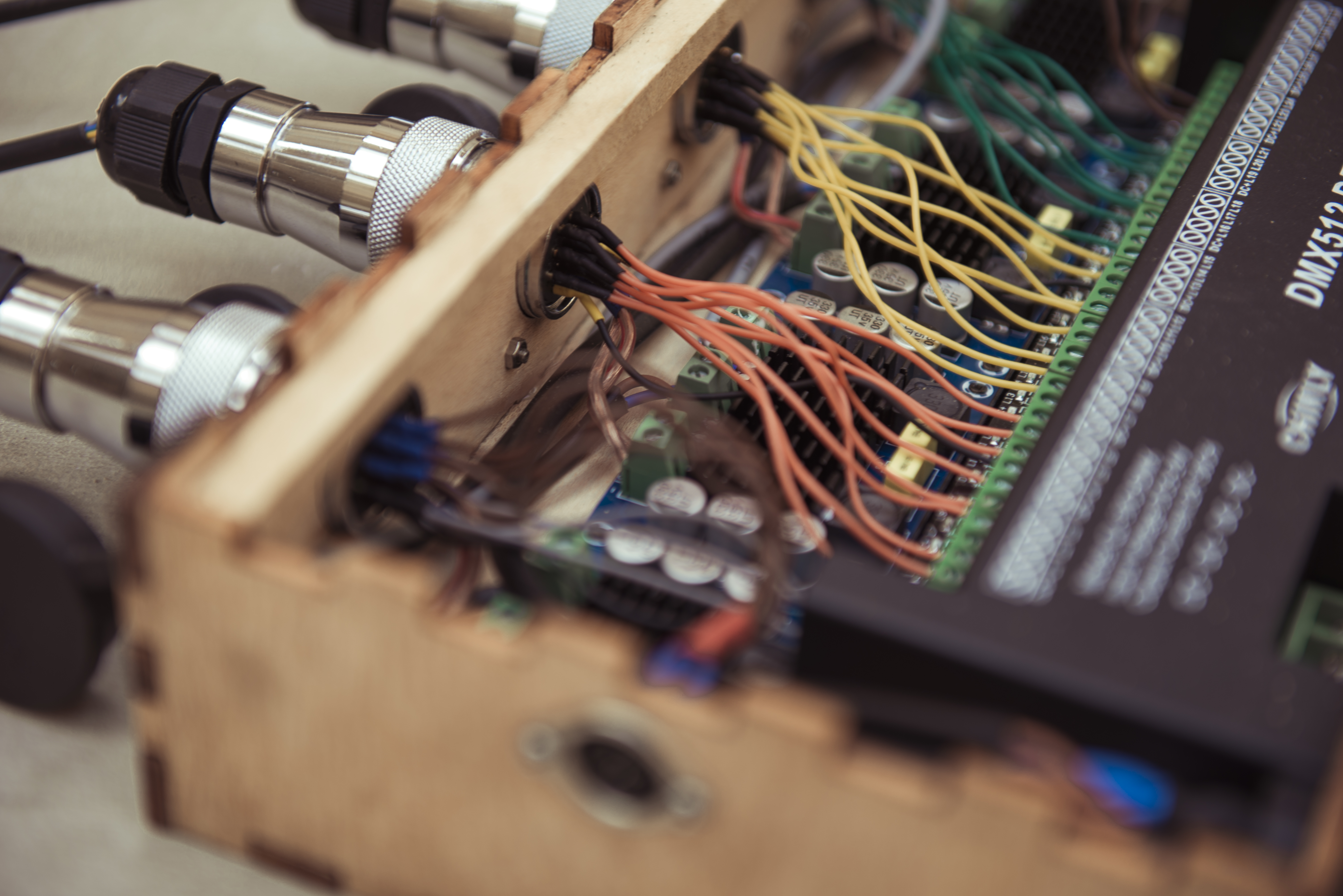 7m x 4,5m x 3m. 12 channel sound, saxophones, steel, wood, speaker cones, LEDs, dmx controllers, custom software, custom electronics, dimmers