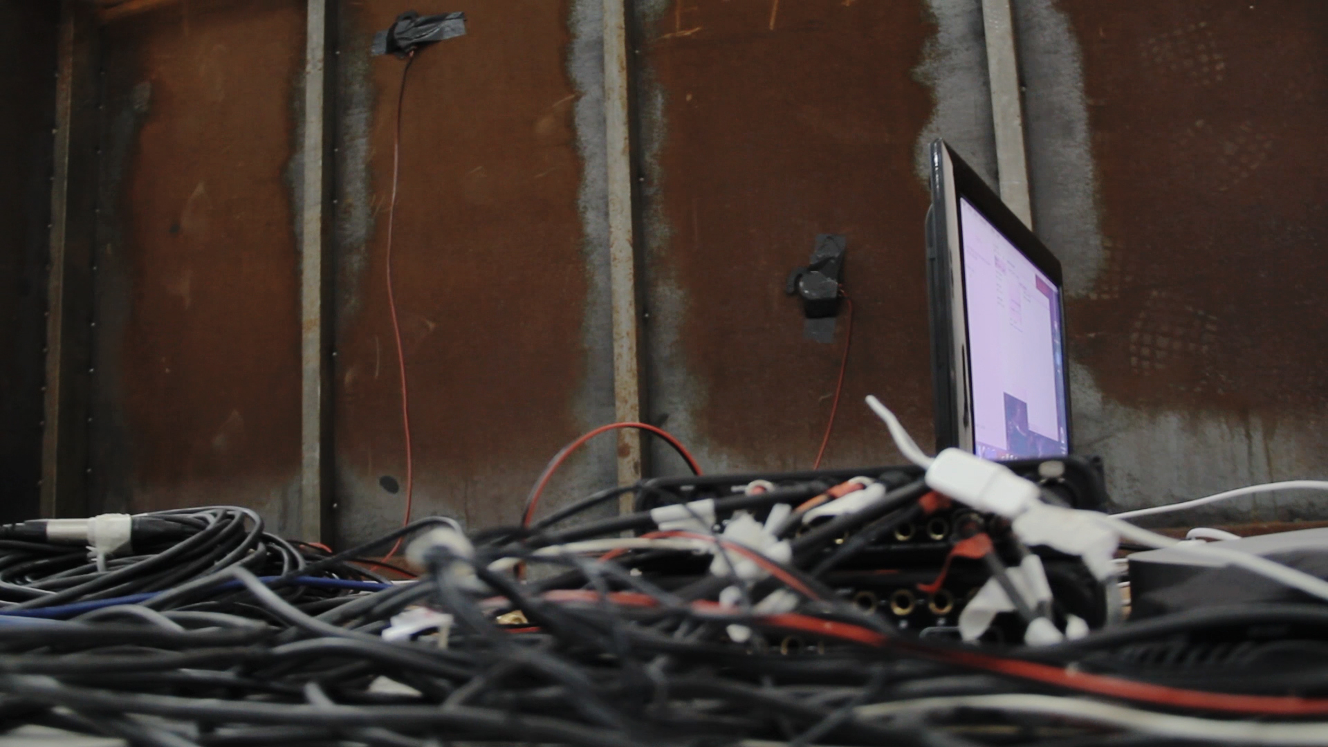 The binaural recordings are played through two sound exciter transducers placed on the metal table while the other fifteen speakers remain muted.